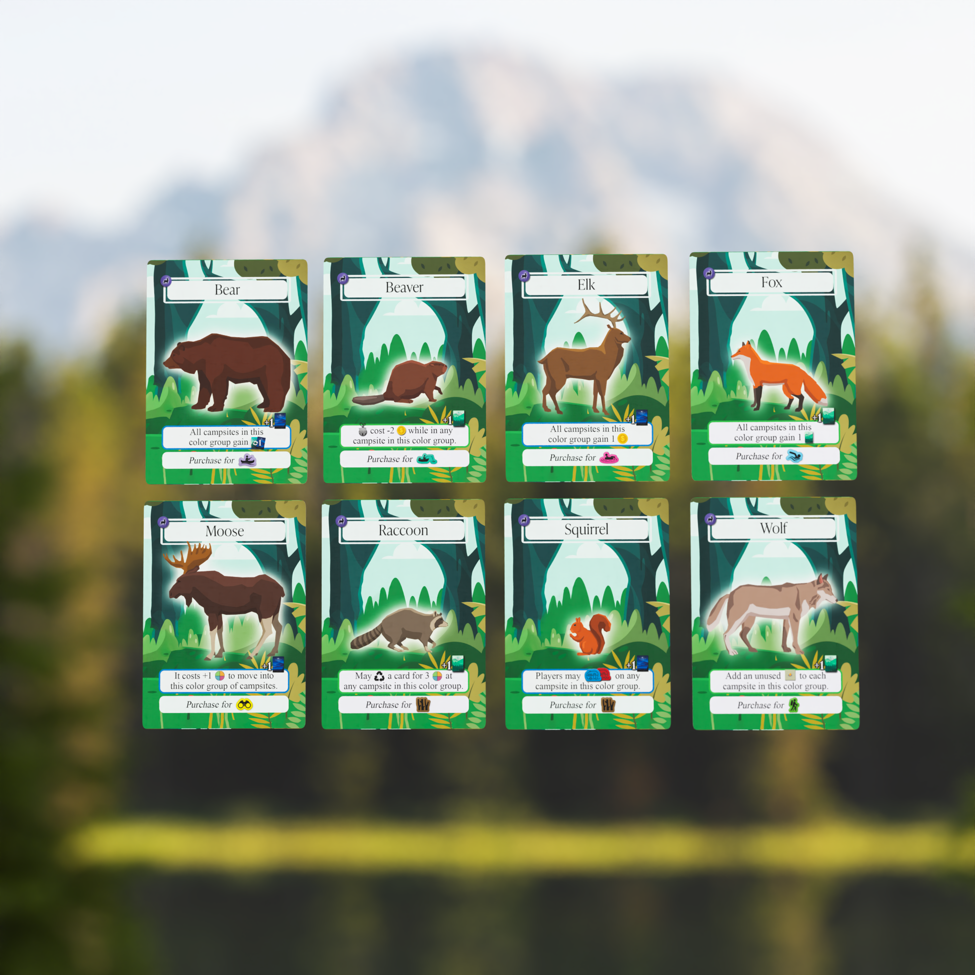 - The player who purchases a wildlife card from the supply decides where the animal from the card gets to roam on the board, affecting all campsites in the color group where the animal is placed. That player also gains a card to add to their collection.
