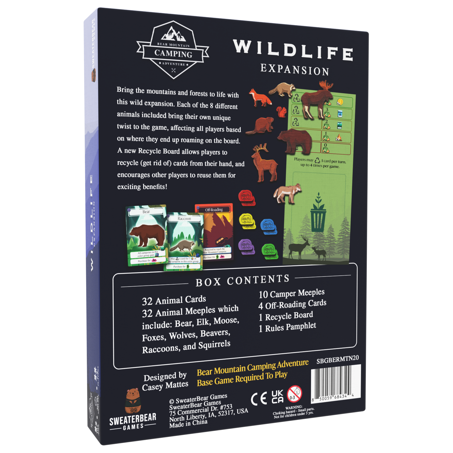 Bring the mountains and forests to life with this wild expansion! Each of the 8 different animals included bring their own unique twist to the game, affecting all players based on where they end up roaming on the board. A new Recycling Board allows players to recycle (get rid of) cards from their hand, and encourages other players to reuse them for exciting benefits!